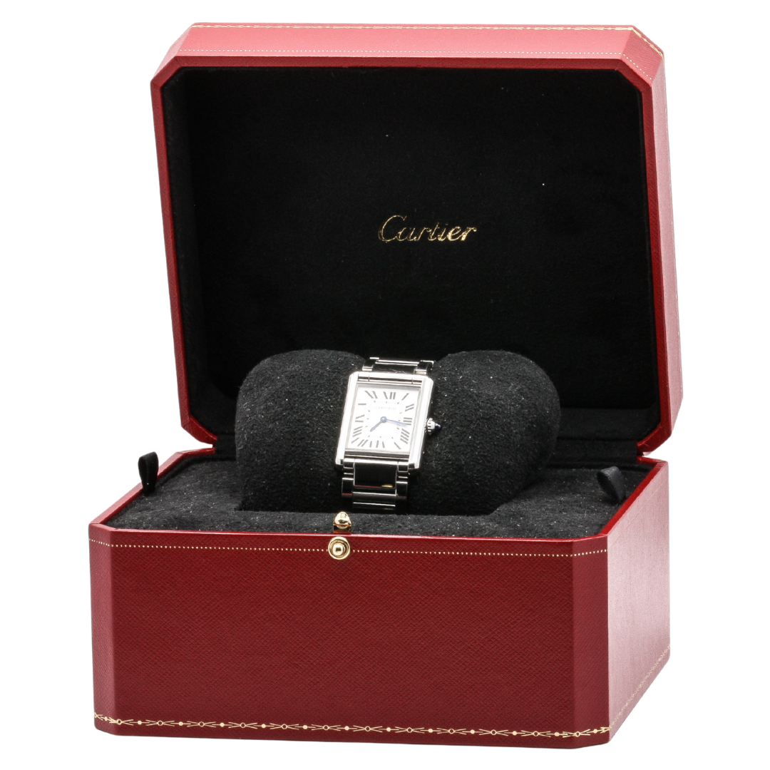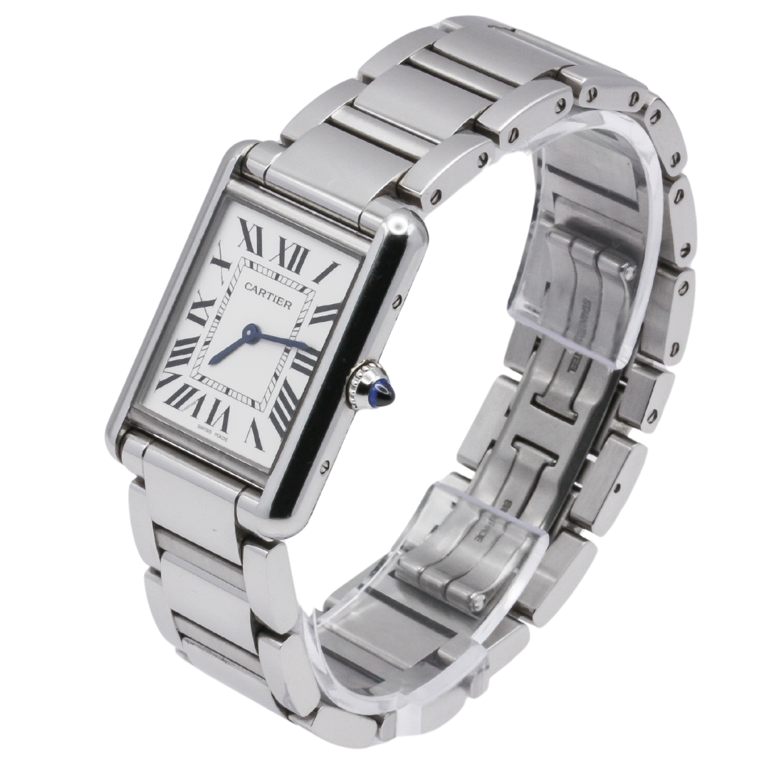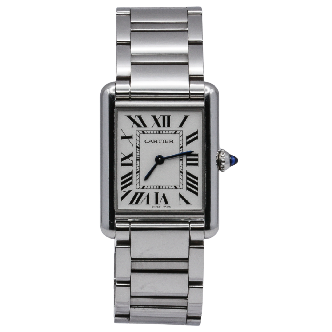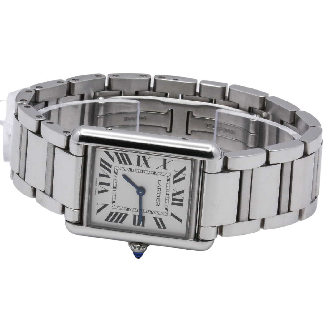 Ladies Cartier wrist watch. Watch reference 4323. Swiss made quartz movement. Steel case & bracelet. Iconic Cartier design. Lovely white dial with roman numeral hour marks. Great condition.