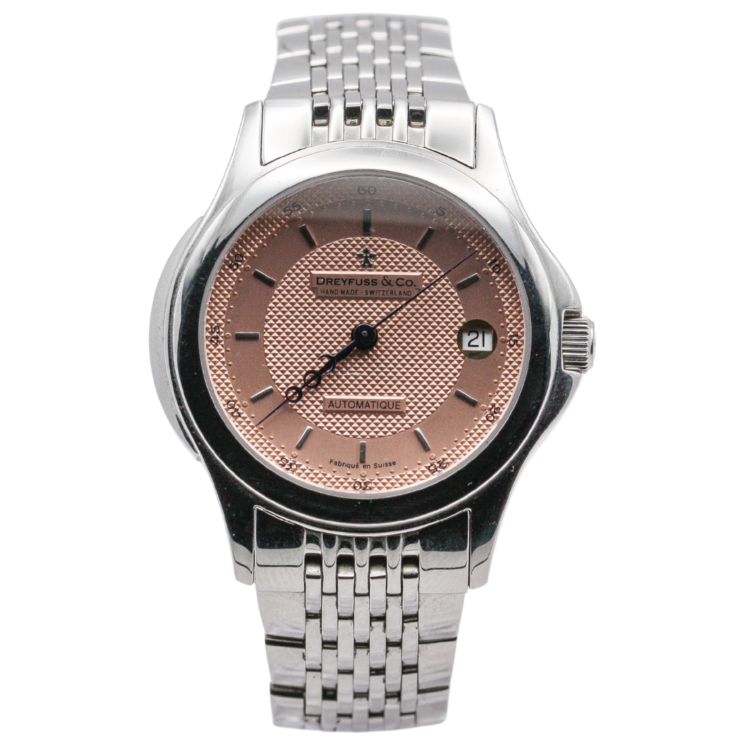 Gentleman's Dreyfuss & Co wrist watch. Serial number 294. Swiss made automatic movement. Steel case and bracelet. Lovely engine turned effect salmon dial.