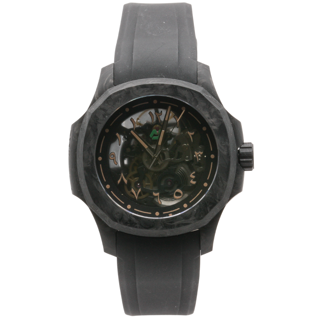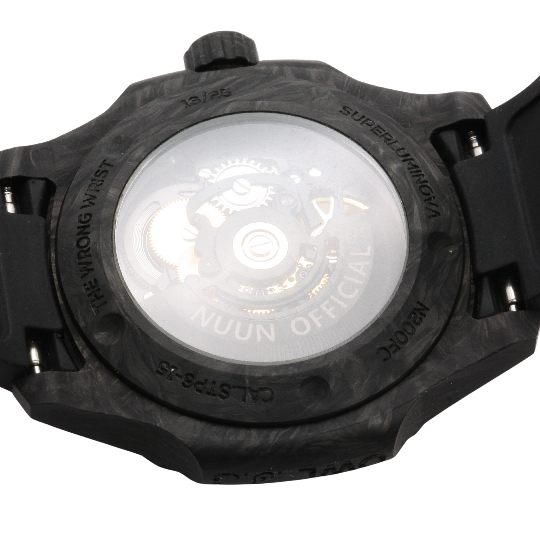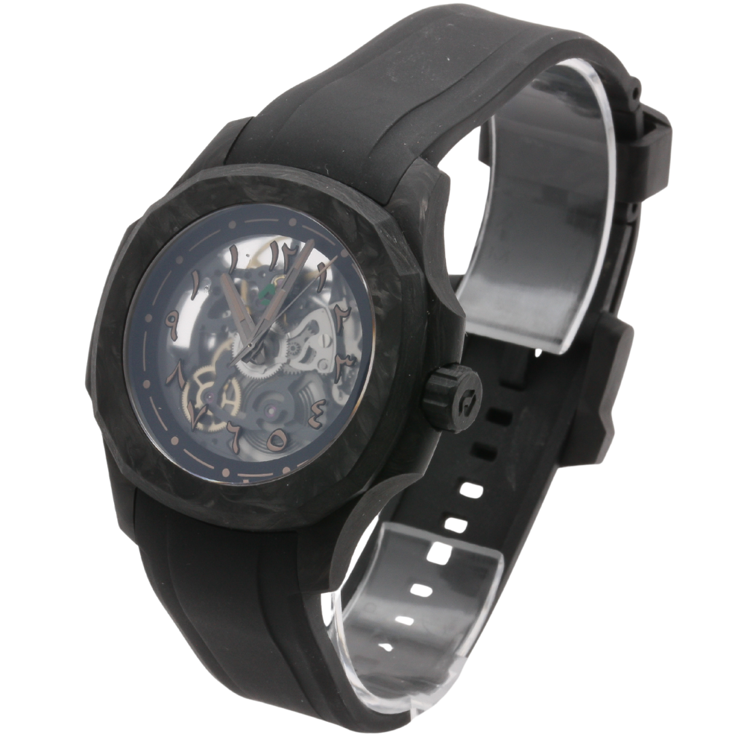 Gentleman's Nuun wrist watch. Reference N200FC. Wrong Wrist model. Limited edition model 13/25. Swiss made automatic movement. Forged carbon case with Delug's black rubber strap. Sapphire glass and exhibition case back. Skeleton dial.