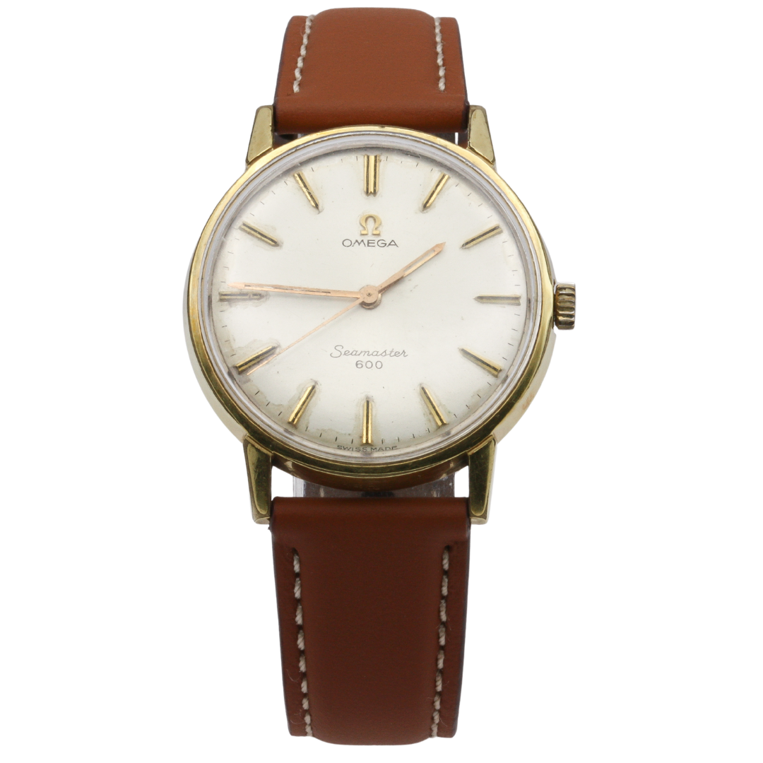 Gentleman's Omega wrist watch. Watch reference 135.011. Swiss made manual wind movement. Gold plated case with non brand leather strap. Glass and crown have been replacement with compatible parts (non Omega).
