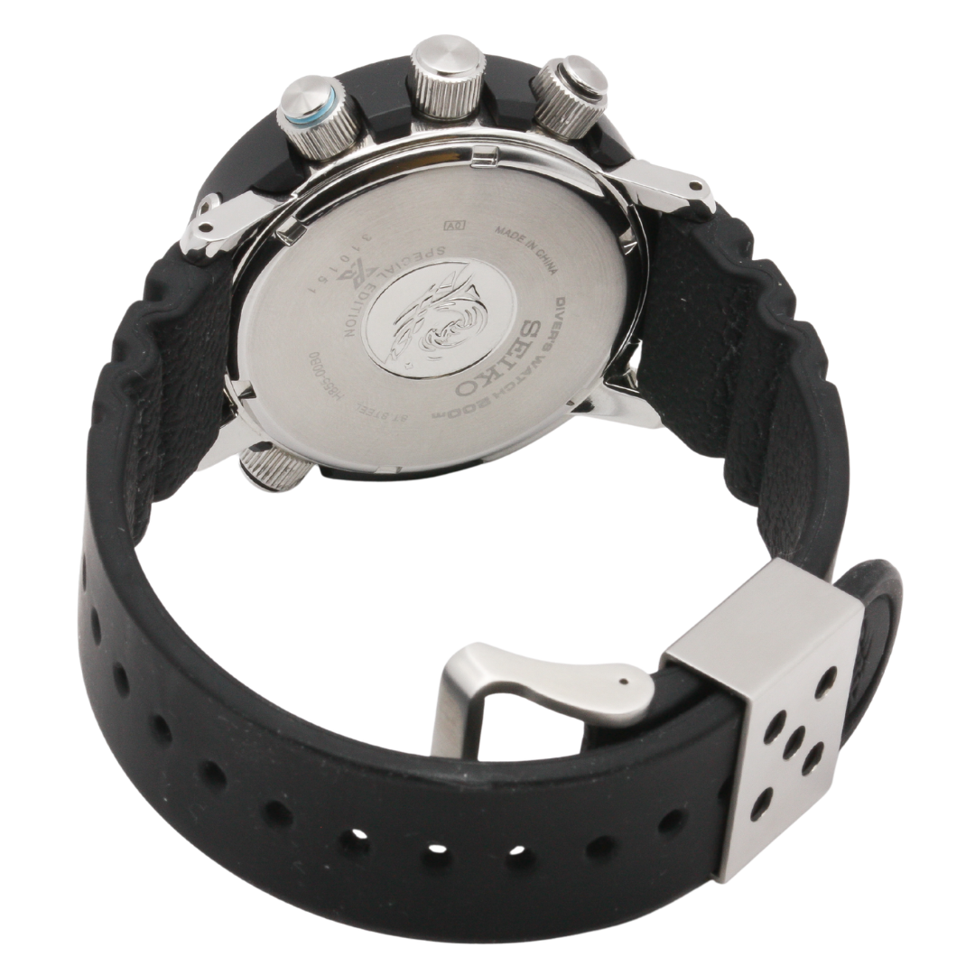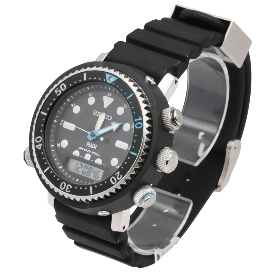 Gentleman's Seiko wrist watch. Watch reference SNJ035. Solar power H855 caliber movement. Dual time dial. Steel case and black rubber details. Special PADI edition with lagoon blue accents. Inspired by the hybrid diver nicknamed the Arnie.