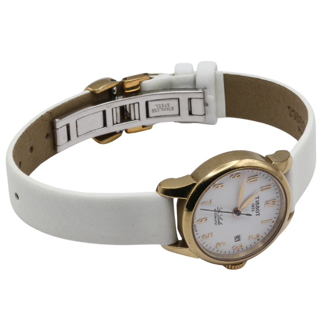 Ladies Tissot wrist watch. Watch reference L134/236. Swiss made automatic movement. Gold plated case with a new white Tissot strap.